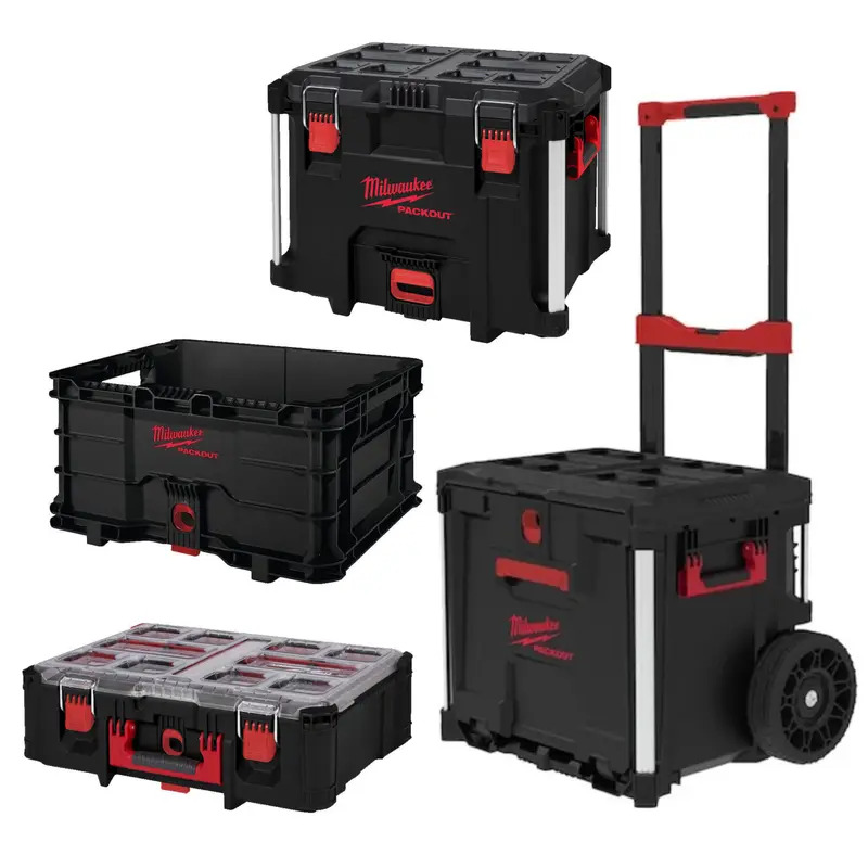 Milwaukee 4 Piece Packout Bundle - Rolling Drawer, XL Tool Box, Deep Organiser & Crate