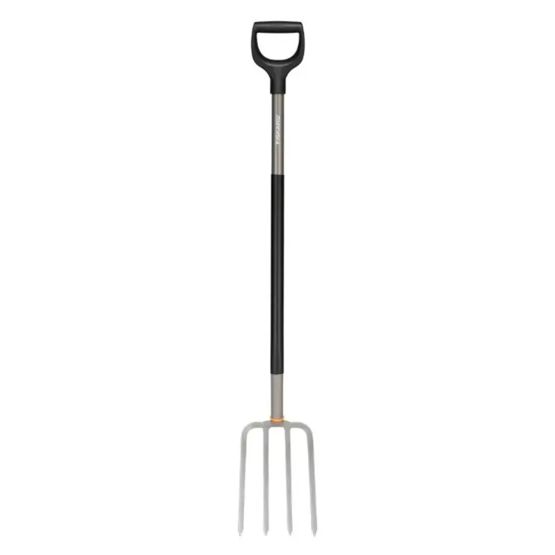 Fiskars Ergonomic™ tools are perfectly optimised from comfort — working with your body to reduce strain and improve performance. The Ergonomic™ Garden fork is the perfect tool for breaking up tough soil and moving bulky materials like leaves, mulch, hay and cut grass. Its angled shaft and handle help keep your body and wrists in a natural position while lifting, reducing strain while working. A D-shaped handle fits all hand sizes, with or without gloves. Sturdy connection between forged steel tines and shaft increases durability for driving into tough soil. The teardrop shaped steel shaft with SoftGrip is also extremely durable while helping to maximise grip and insulate from cold.