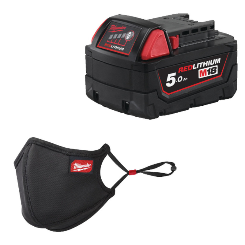 Milwaukee M18B5 18V 5.0Ah Battery & Milwaukee 3-Layer Performance Face Mask *PACK OF 3* Select mask size