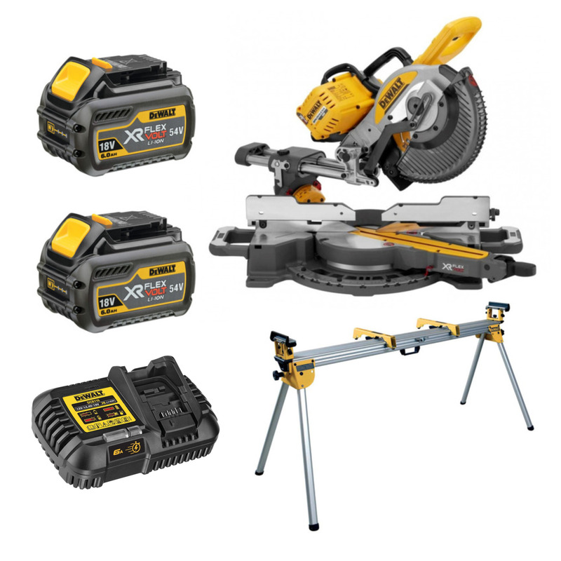 DeWalt DCS727T2 54V XR Flexvolt 250mm Double Bevel Slide Mitre Saw Kit With DE7023 Stand - 2 x 6ah Batteries