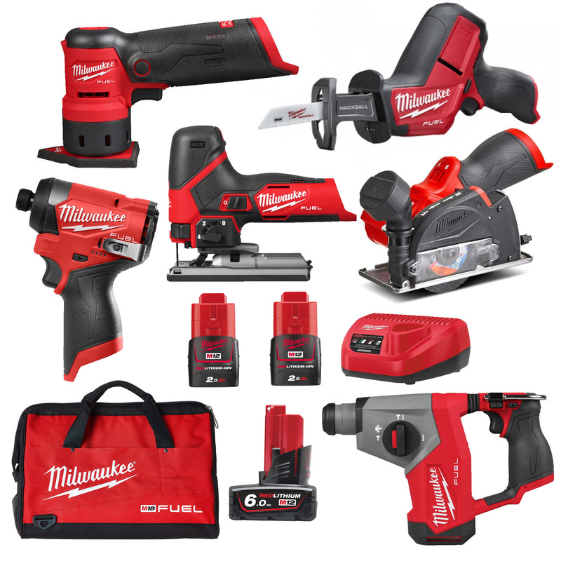 Milwaukee 6 Piece M12 Fuel Brushless Tool Kit - 2 x 2.0ah Batteries & 1 x 6.0ah Battery