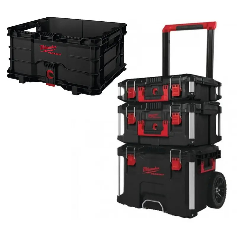 Milwaukee has revolutionised tool transportation, organization, and storage for the trades with the new PACKOUT™ Modular Storage System. Designed to provide users with the ability to interchange and interlock a wide assortment of heavy duty tool boxes, organizers, and storage totes in multiple different configurations. The 3 piece PACKOUT™ Set contains 1x - 4932464078 - PackOut trolley box, 1x - 4932464079 - PackOut large box, 1x - 4932464080 - PackOut box.