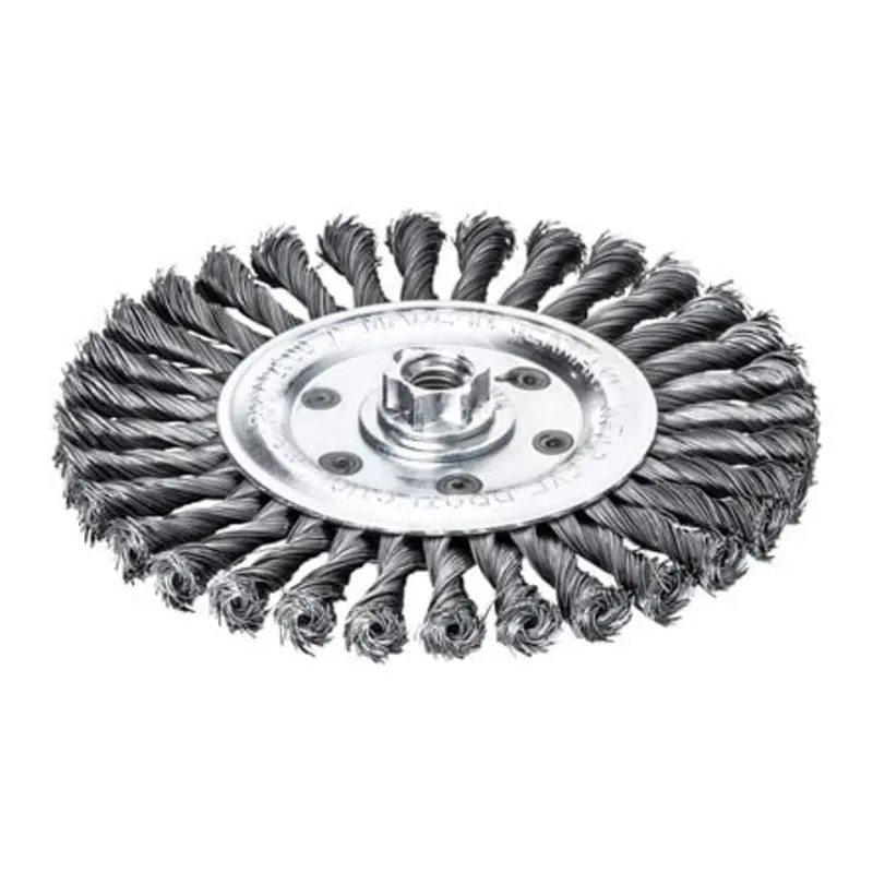 Wheel brushes with knotted wire are used for pre and post processing of weld seams, aggressive removal of scale, rust and slag and for heavy brushing work.