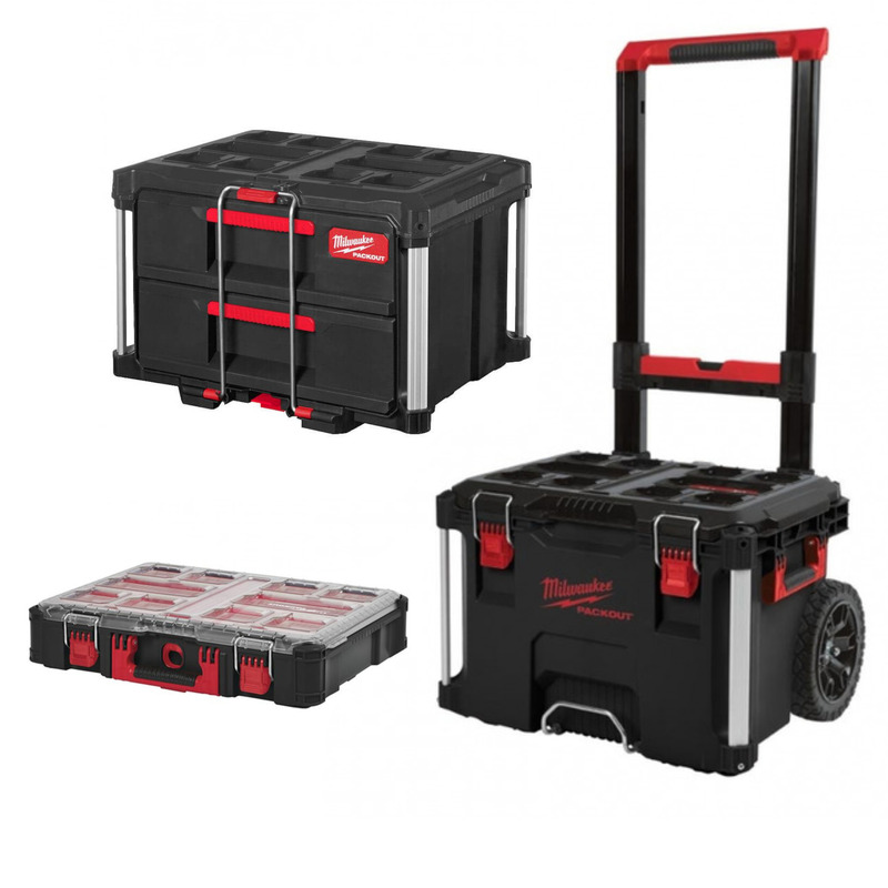 Milwaukee 4932464078 Packout Trolley Case, 4932472129 2 Drawer Tool Box & 4932464082 Organiser Case